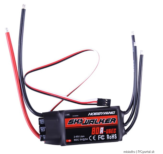 Predam novy regulator SkyWalker 80A V2 UBEC 7A Max. prud 80A(100A kratkodobo) Napajanie 3-6S Lipo BEC vystup 5V, 7A Rozmery: 85x36x9 mm Vaha: 79g Moznost nastavenia reverzneho tahu Cena: 35…